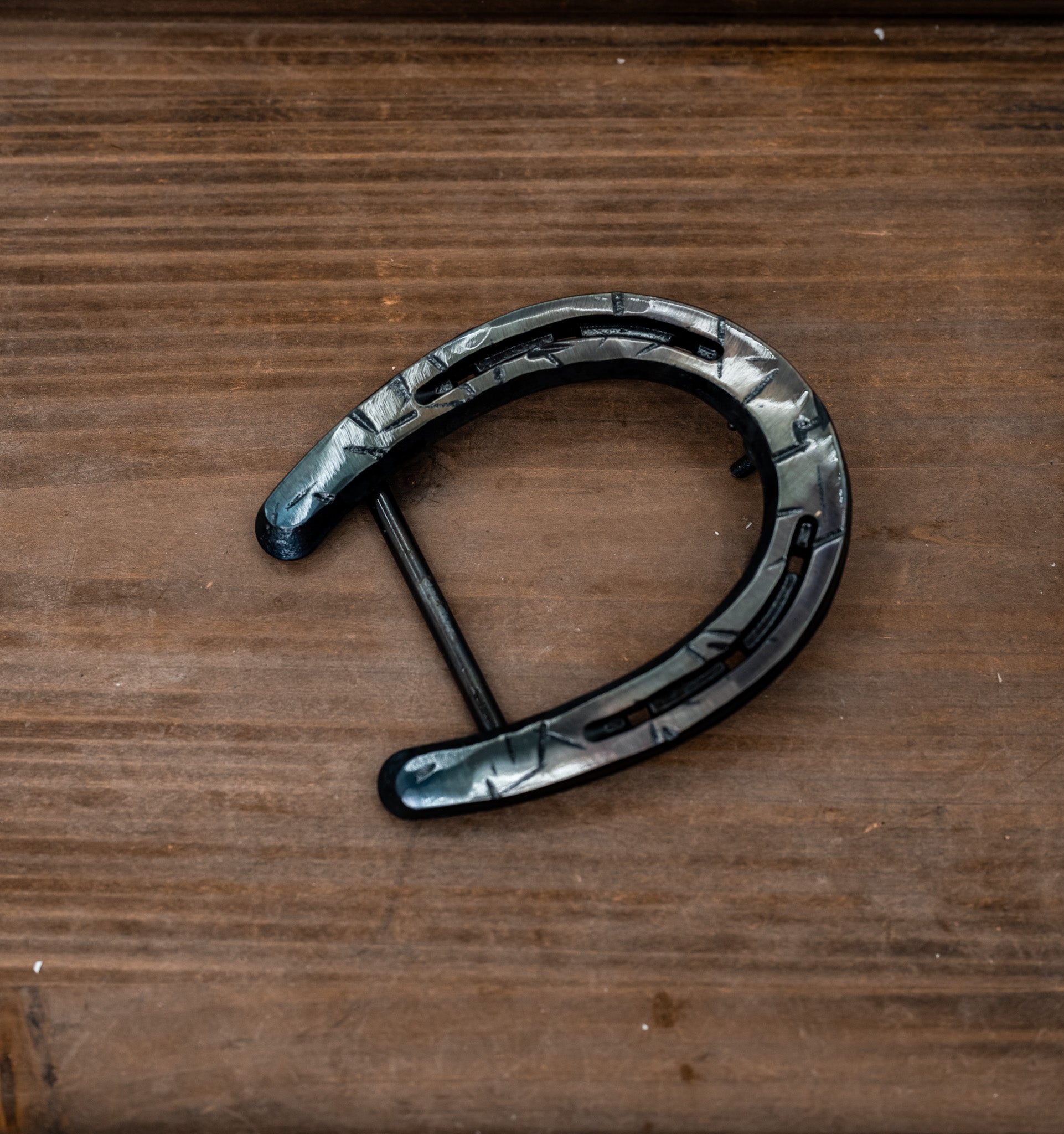 The Blued Distressed Pony Shoe Buckle offers a distinctive, one-of-a-kind design with its expertly crafted distressed finish. This buckle combines rugged style with timeless appeal, making it a standout accessory for any belt. Its unique character ensures no two pieces are exactly alike, perfect for those seeking authenticity and individuality in their wardrobe.