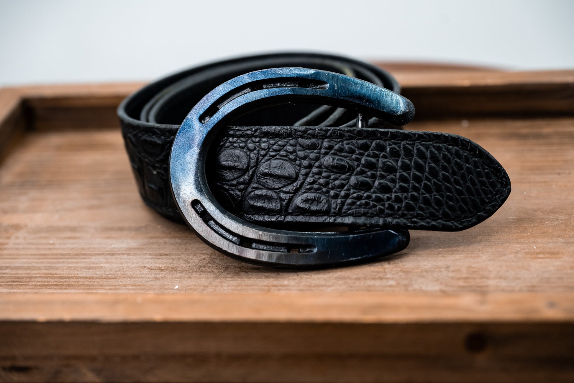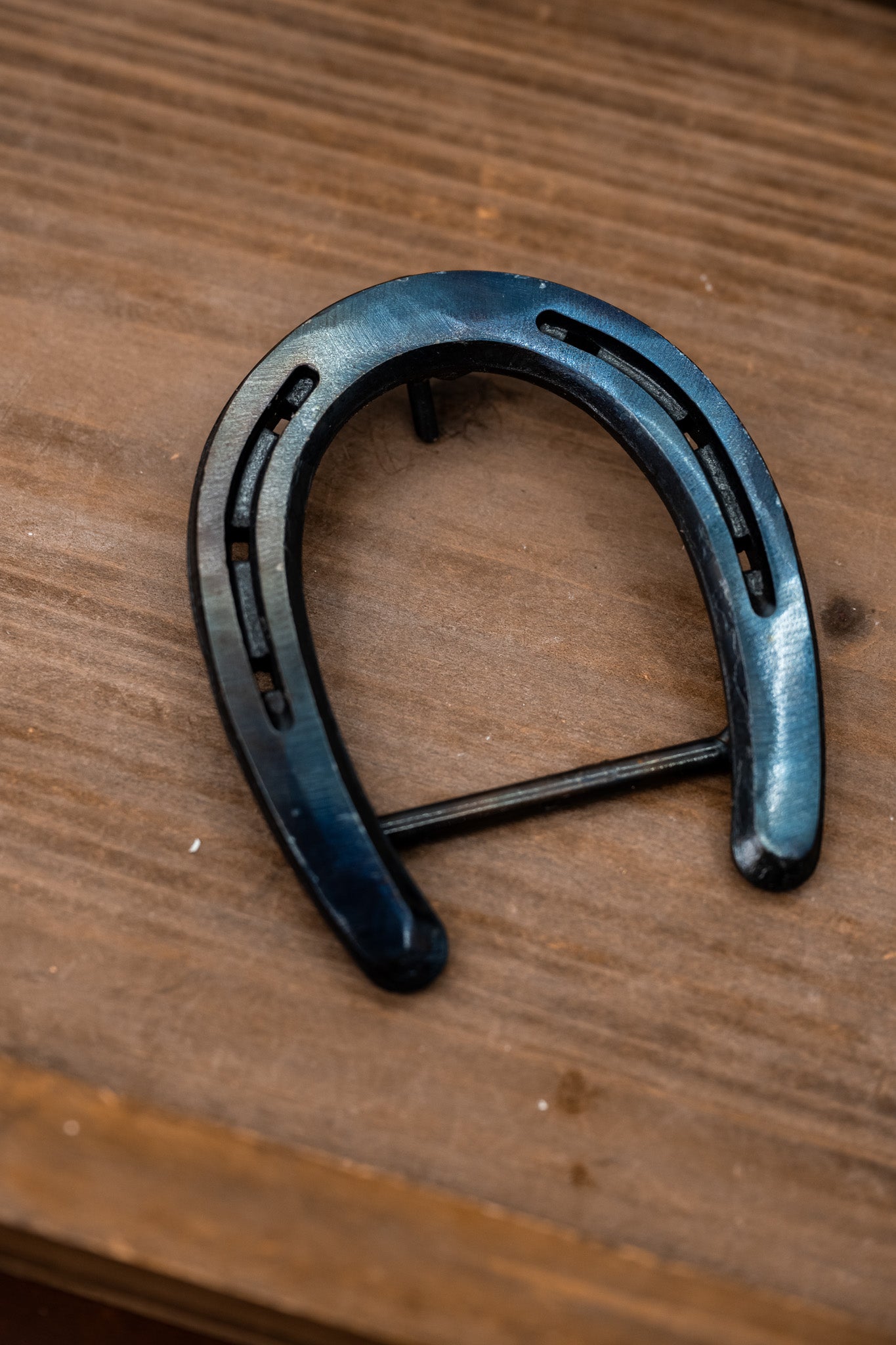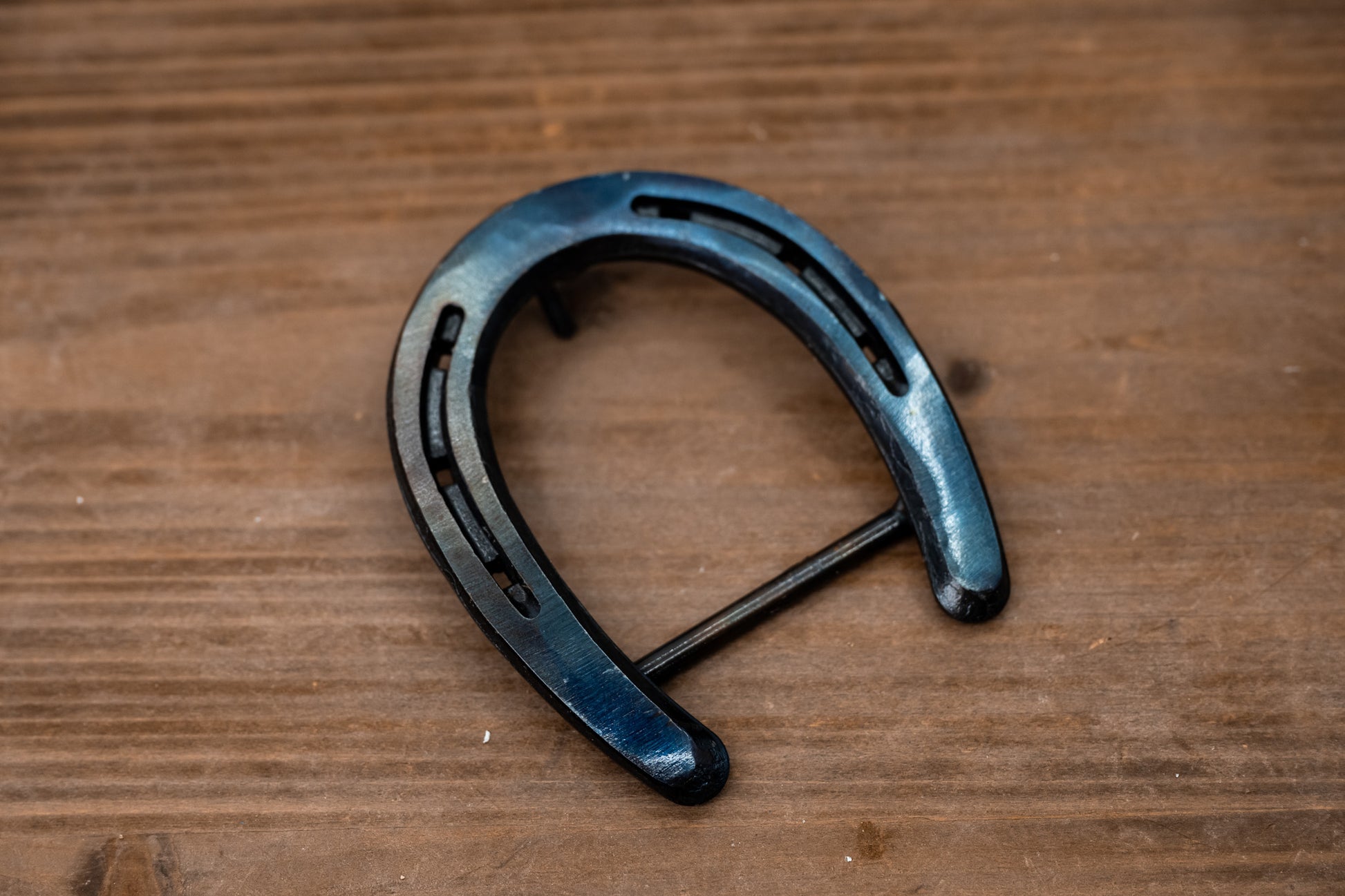 This expertly crafted Blued Pony Shoe belt buckle features a unique, smaller design with distinctive blue/black coloring that complements fine jewelry. Its elegant finish and detailed craftsmanship make it a refined accessory for those seeking subtle sophistication in their belt hardware. Ideal for adding a touch of luxury and individuality to your wardrobe.