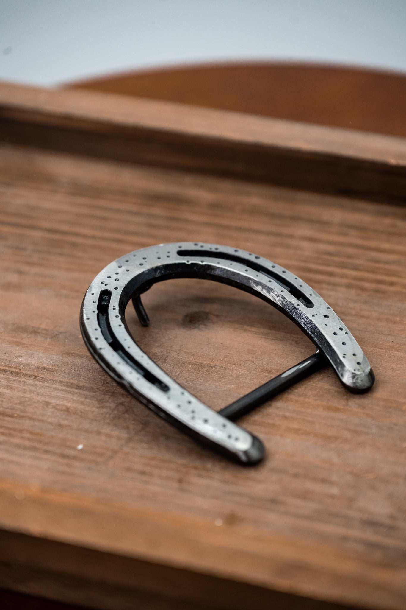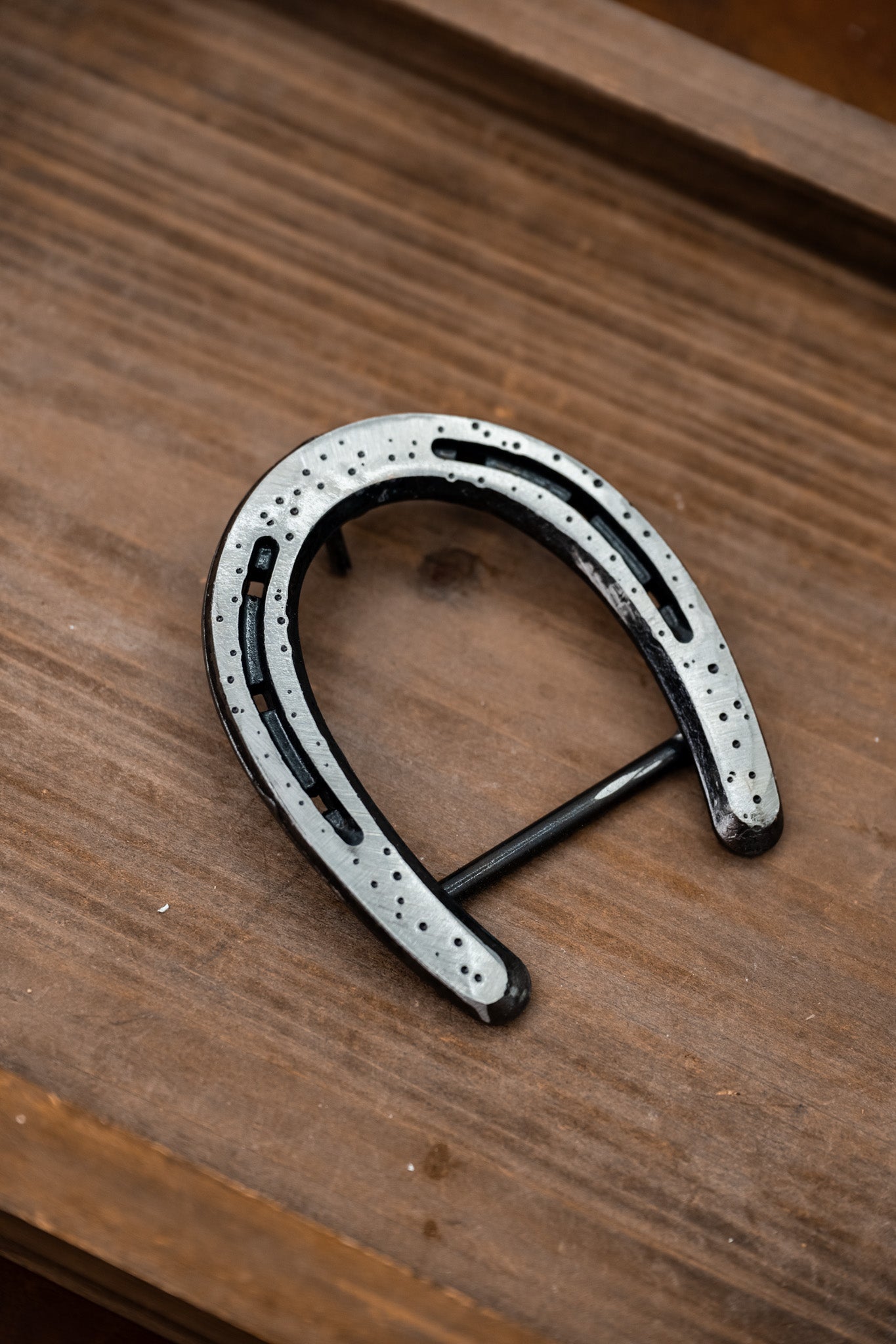 The Silver Polished Dimpled Pony Shoe Buckle offers a distinctive, one-of-a-kind design with its expertly crafted finish. This buckle combines rugged style with timeless appeal, making it a standout accessory for any belt. Its unique character ensures no two pieces are exactly alike, perfect for those seeking authenticity and individuality in their wardrobe